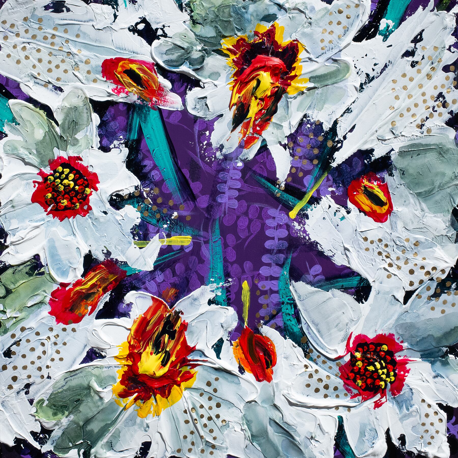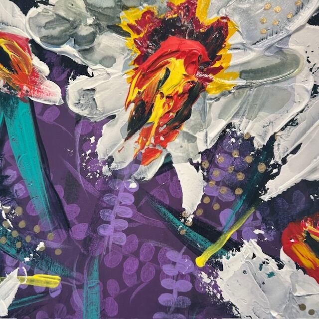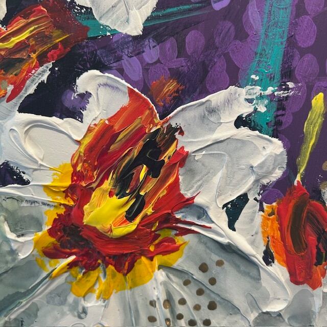 木パネルに厚盛りのアクリル絵の具の作品で、額縁不要でそのまま壁に掛けてお楽しみいただけます。