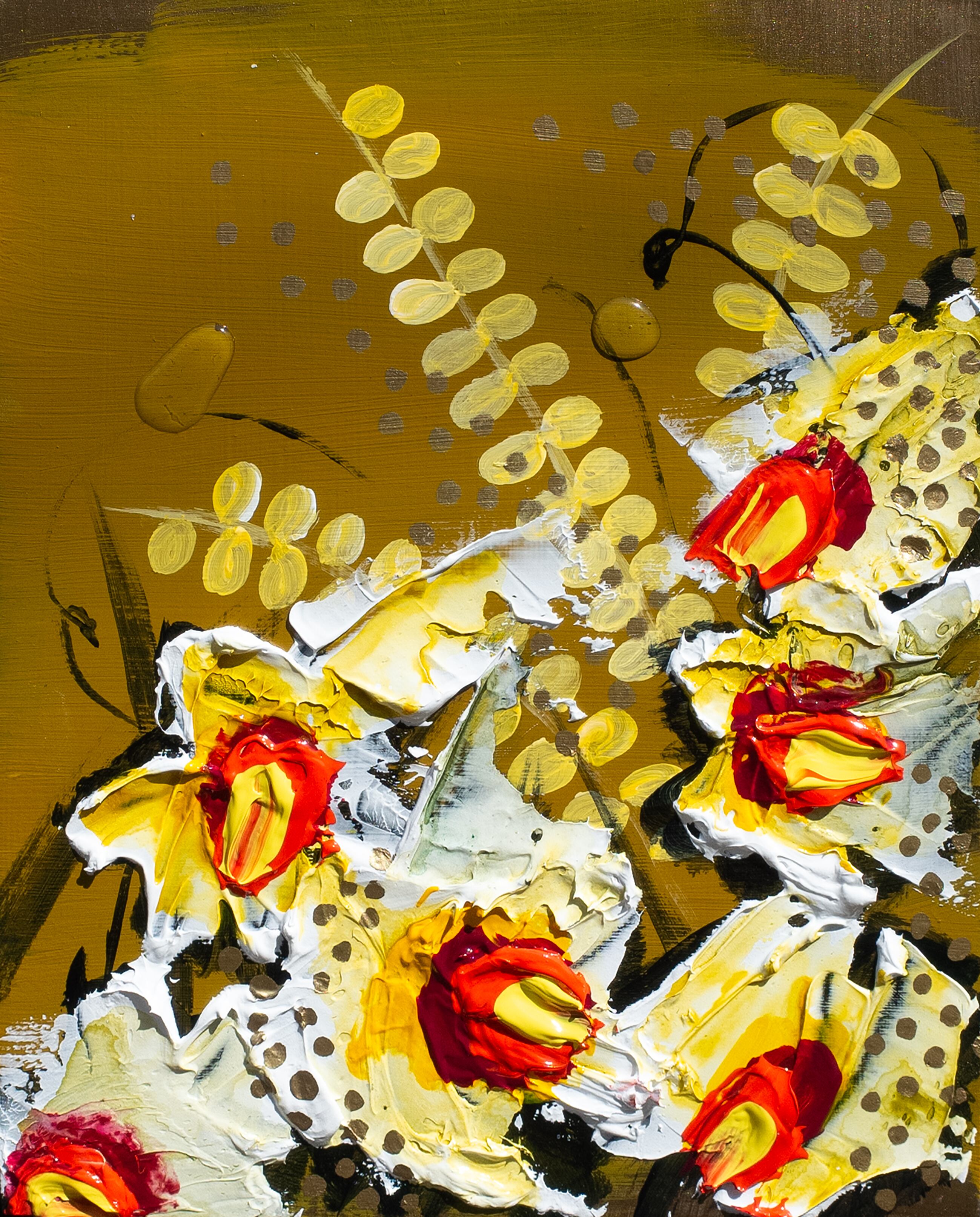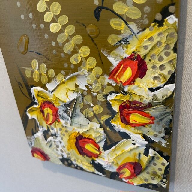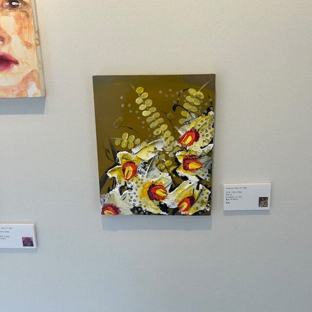 木パネルに厚盛りのアクリル絵の具とレジンを使った作品で、額縁不要でそのまま壁に掛けてお楽しみいただけます。