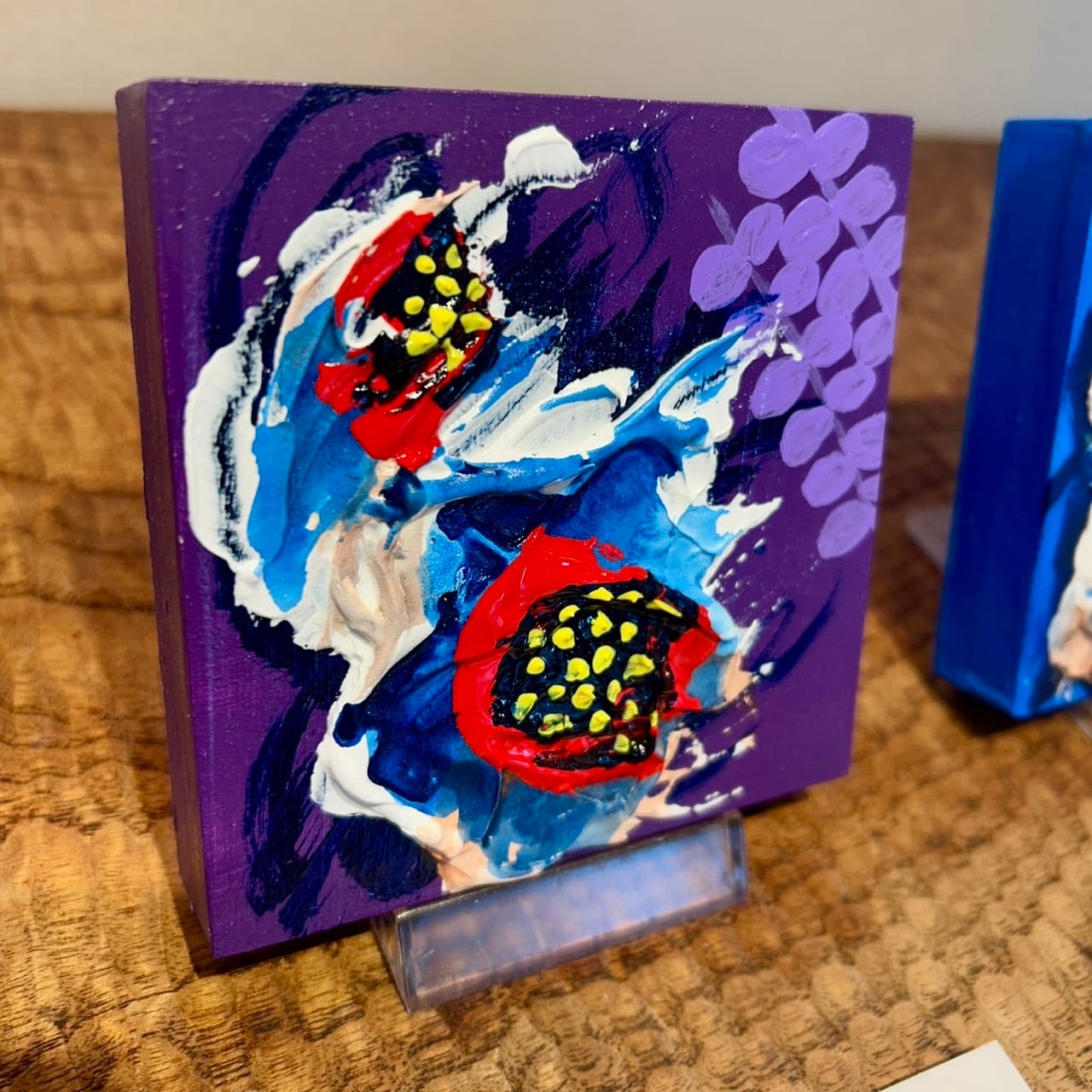 木パネルにアクリル絵の具を厚盛りにしています。透明アクリル台座付きで、机の上に置いても楽しめます。