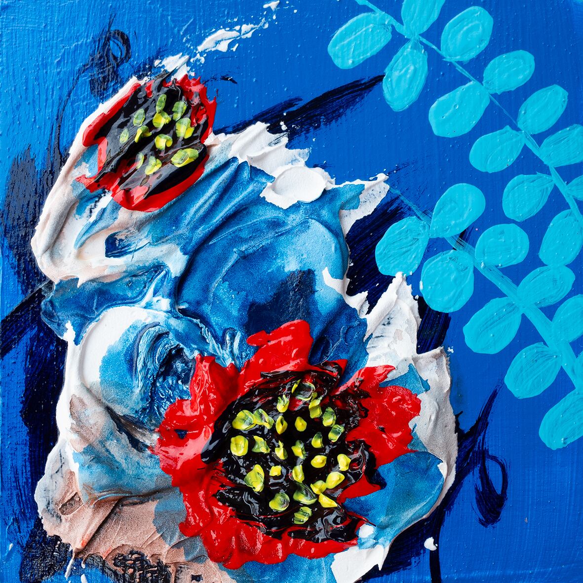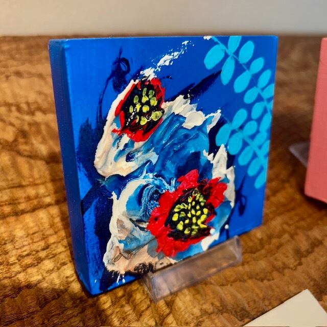 木パネルにアクリル絵の具を厚盛りにしています。透明アクリル台座付きで、机の上に置いても楽しめます。