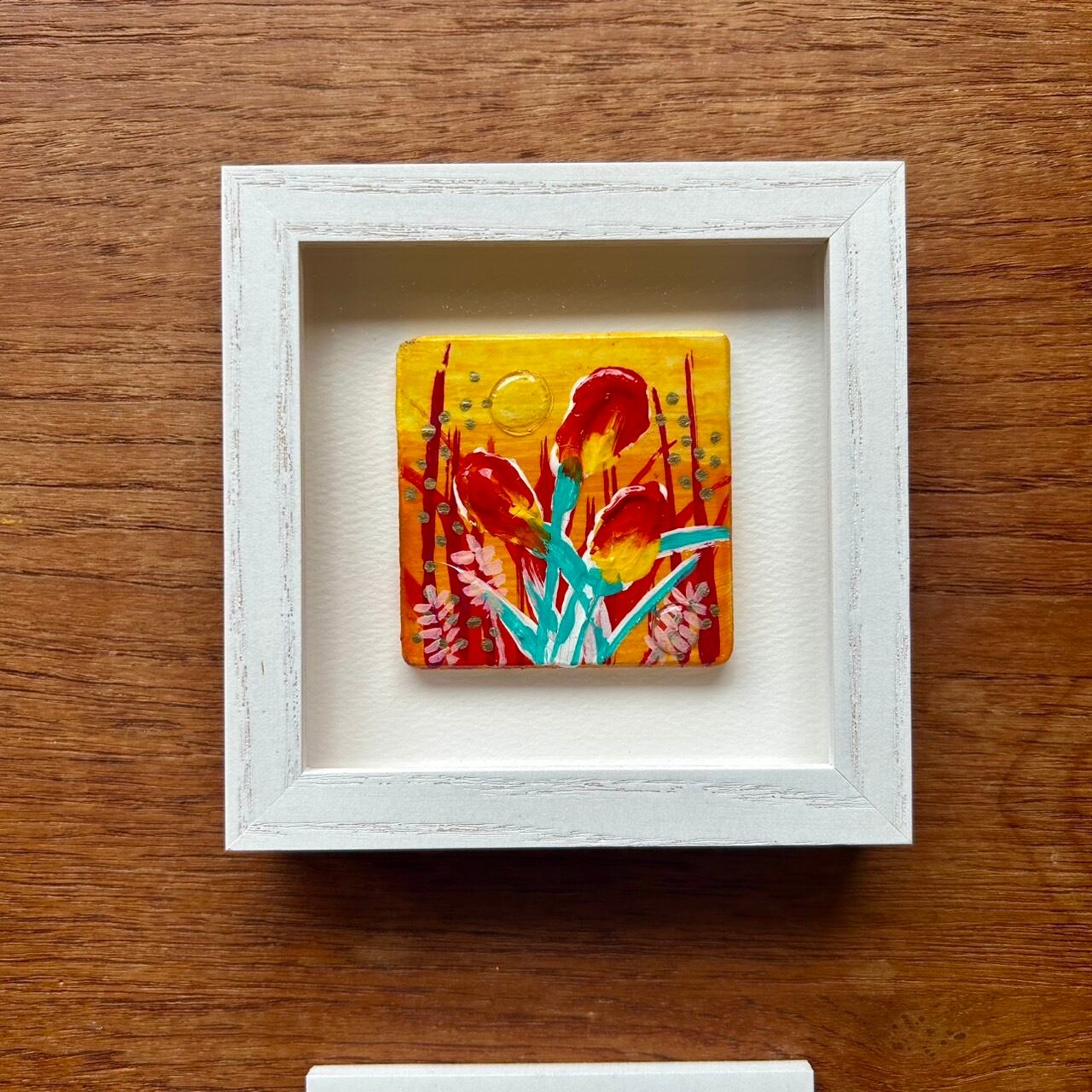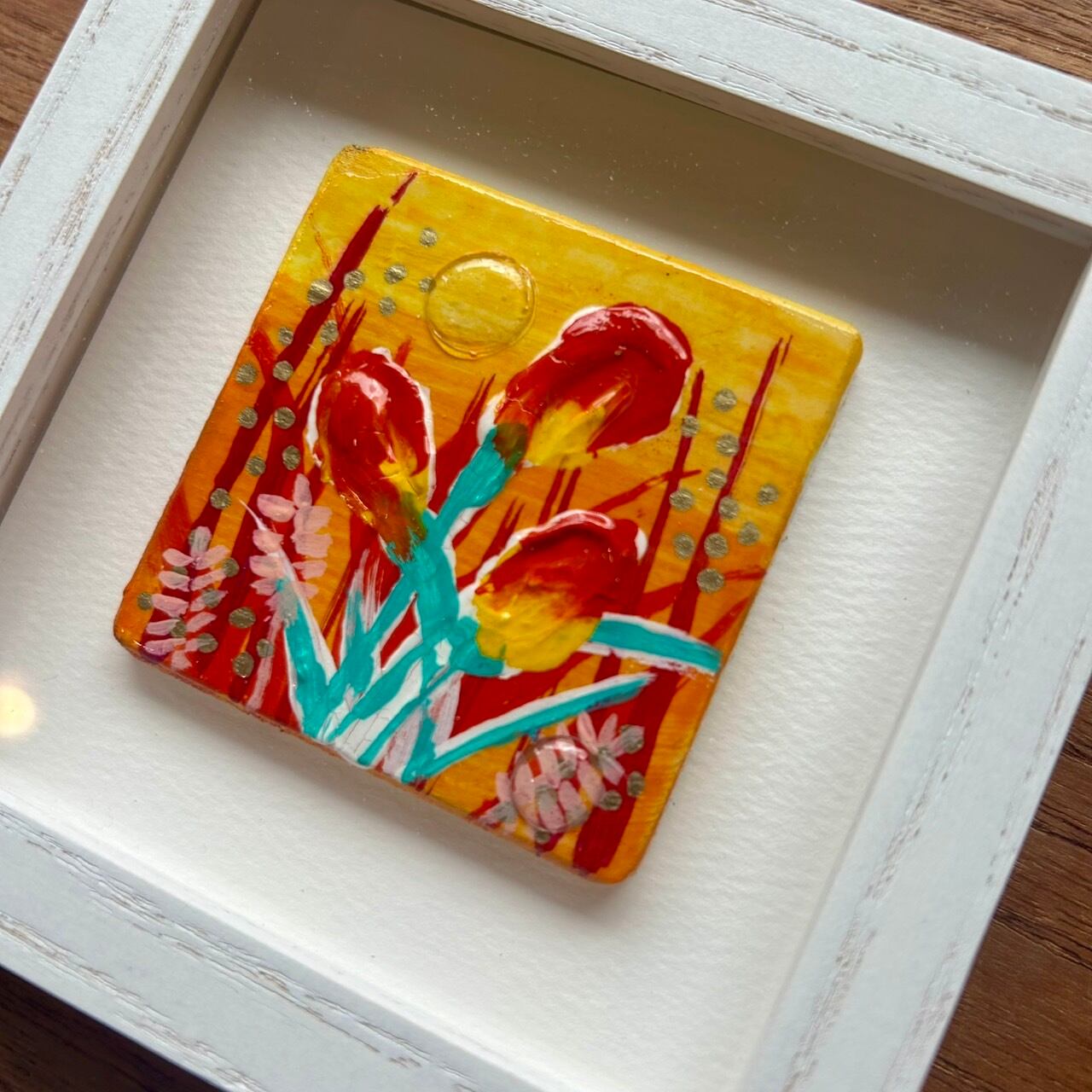 木パネルに厚盛りのアクリル絵の具とレジンを使った作品です。