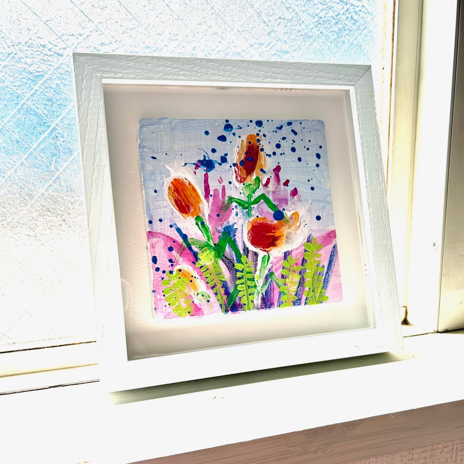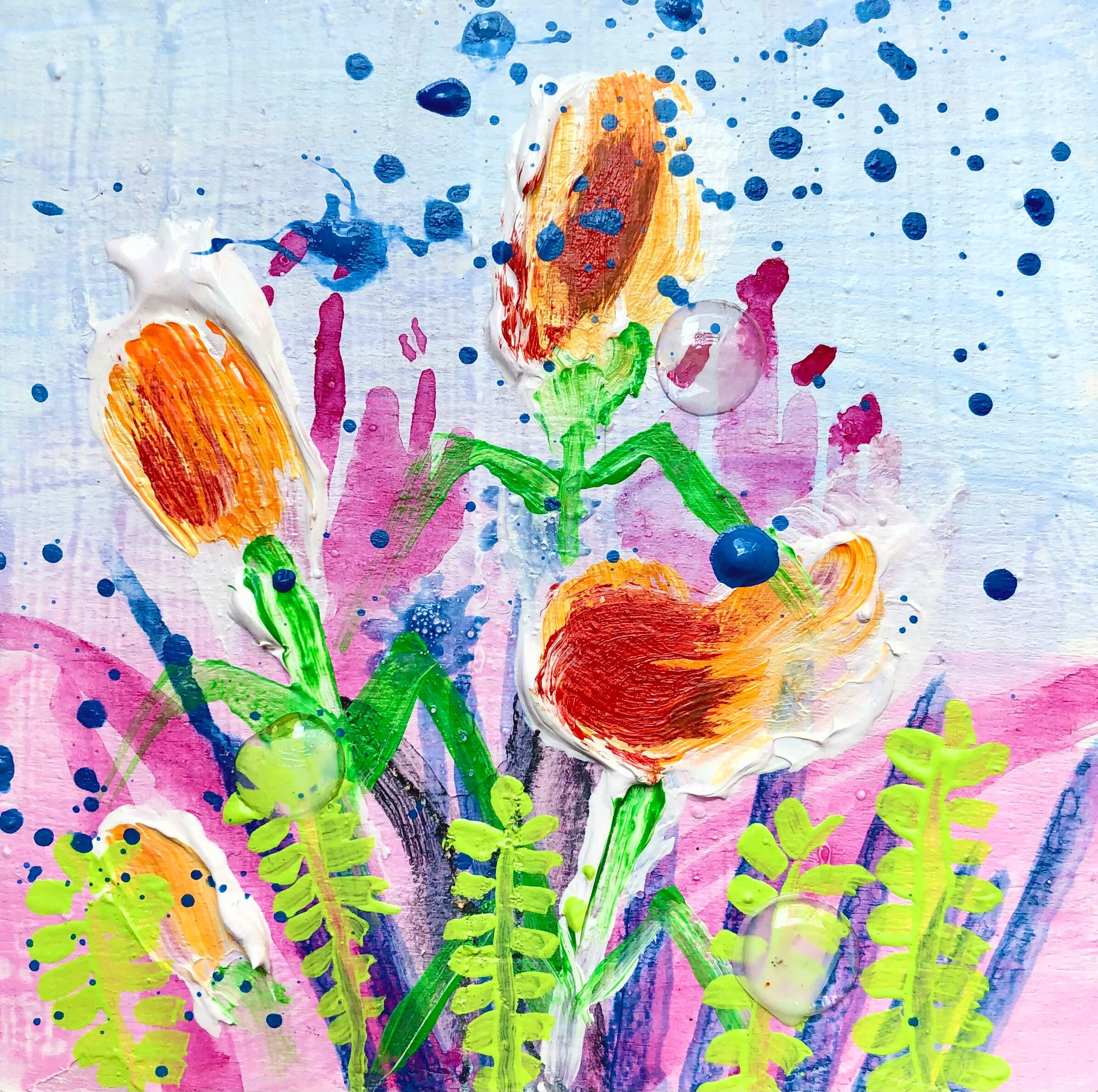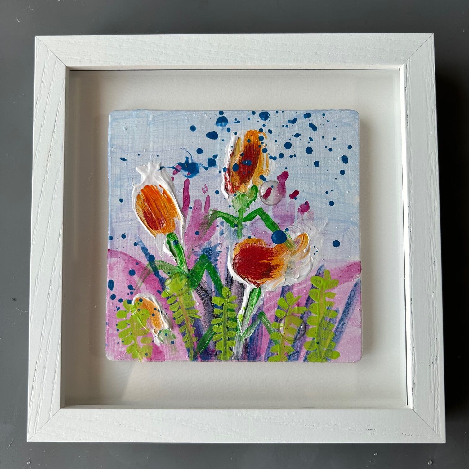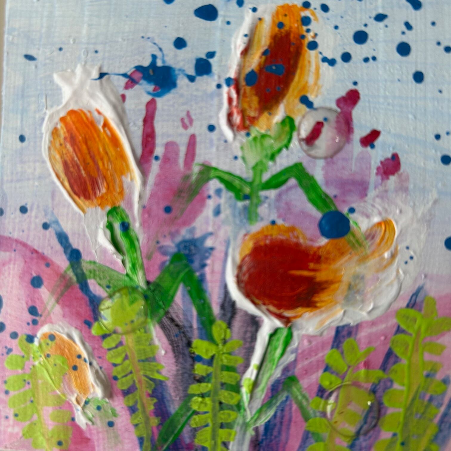 木パネルに厚盛りのアクリル絵の具とレジンを使った作品です。